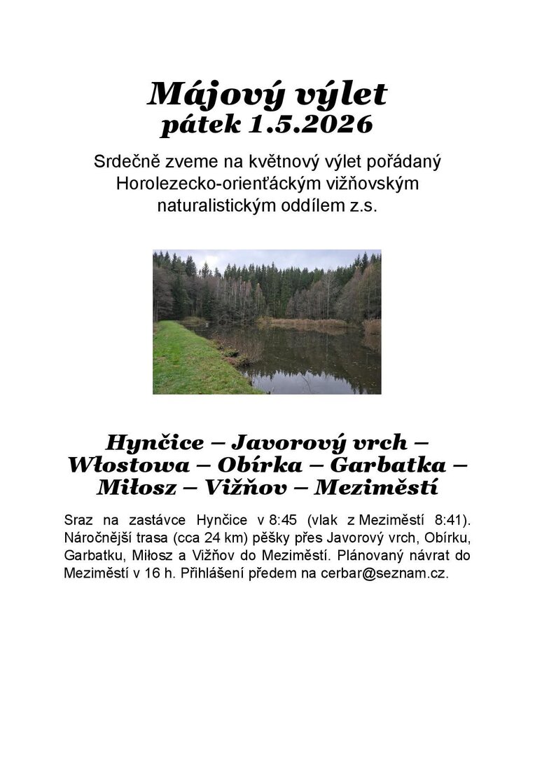 Srdečně zveme všechny milovníky náročnější turistiky na náš tradiční Májový výlet. Čeká nás krásná trasa přes Javorový vrch a polské pomezí.