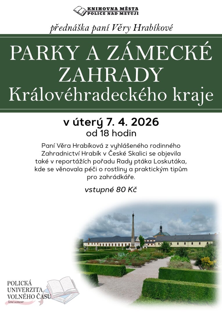 Zveme vás na inspirativní přednášku paní Věra Hrabíková ze Zahradnictví Hrabík, která nás provede krásami parků a zámeckých zahrad Královéhradecký kraj. Paní Hrabíková je zkušená zahradnice z rodinného zahradnictví, dlouhodobě se věnuje pěstování okrasných i užitkových rostlin a svou lásku k zahradám ráda sdílí i s veřejností prostřednictvím přednášek a besed. Čeká vás povídání plné inspirace, fotografií a osobních postřehů z navštívených míst.