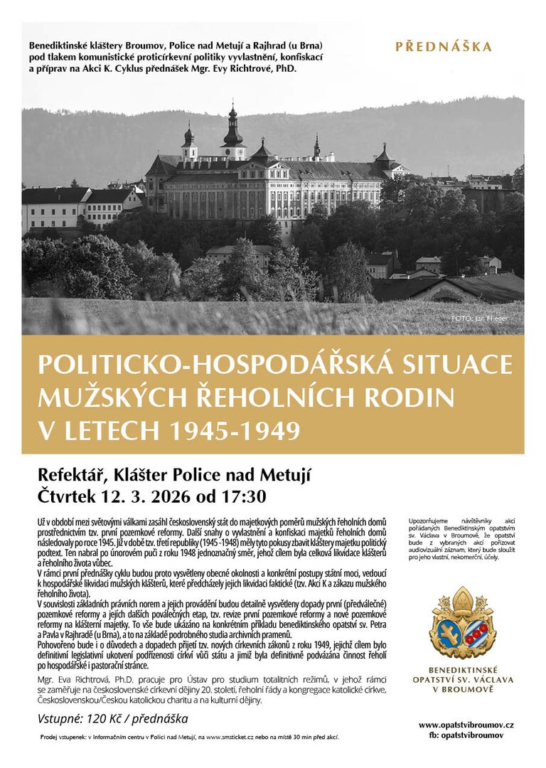 V rámci první přednášky cyklu budou proto vysvětleny obecné okolnosti a konkrétní postupy státní moci, vedoucí k hospodářské likvidaci mužských klášterů, které předcházely jejich likvidaci faktické (tzv. Akci K a zákazu mužského řeholního života).