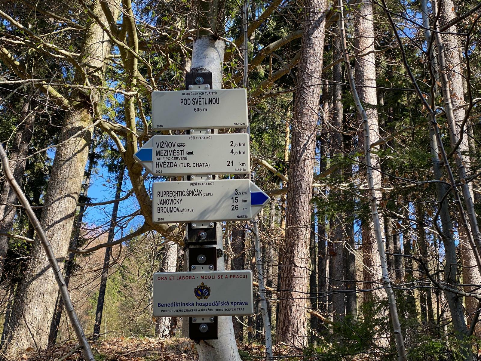 Vydávám se po asfaltce nahoru a na prvním rozcestí zahýbám doleva přes Ruprechtický potok. (na konci článku najdete celou trasu výletu s odkazem na mapy.cz). Po krátkém stoupání už na mě čeká první nádherný výhled na Ruprechtice a broumovskou kotlinu, v pozadí s Broumovskými stěnami. Lavičku lákající k rozjímání protentokrát ignoruju a za líbezného ptačího zpěvu stoupám lesní cestou k dalšímu rozcestí, kde se vpravo „Pod Světlinou“ napojím na modrou turistickou cestu.
