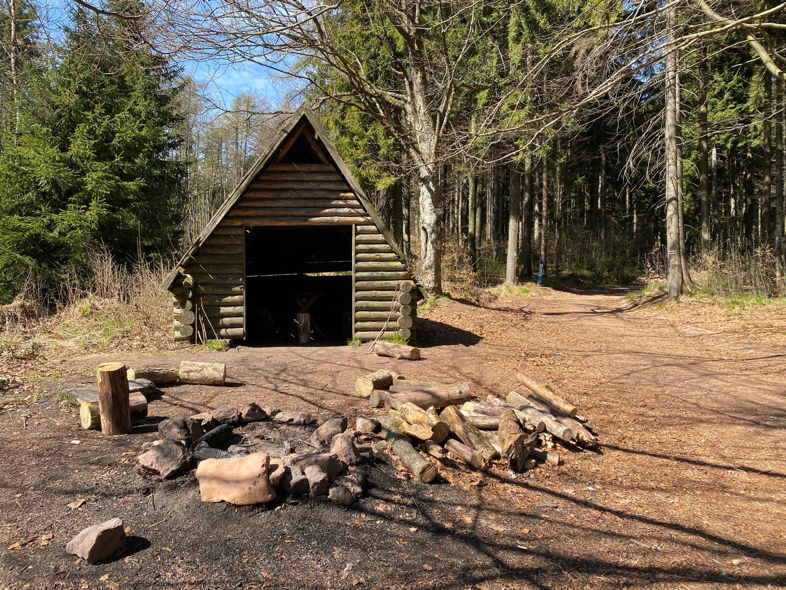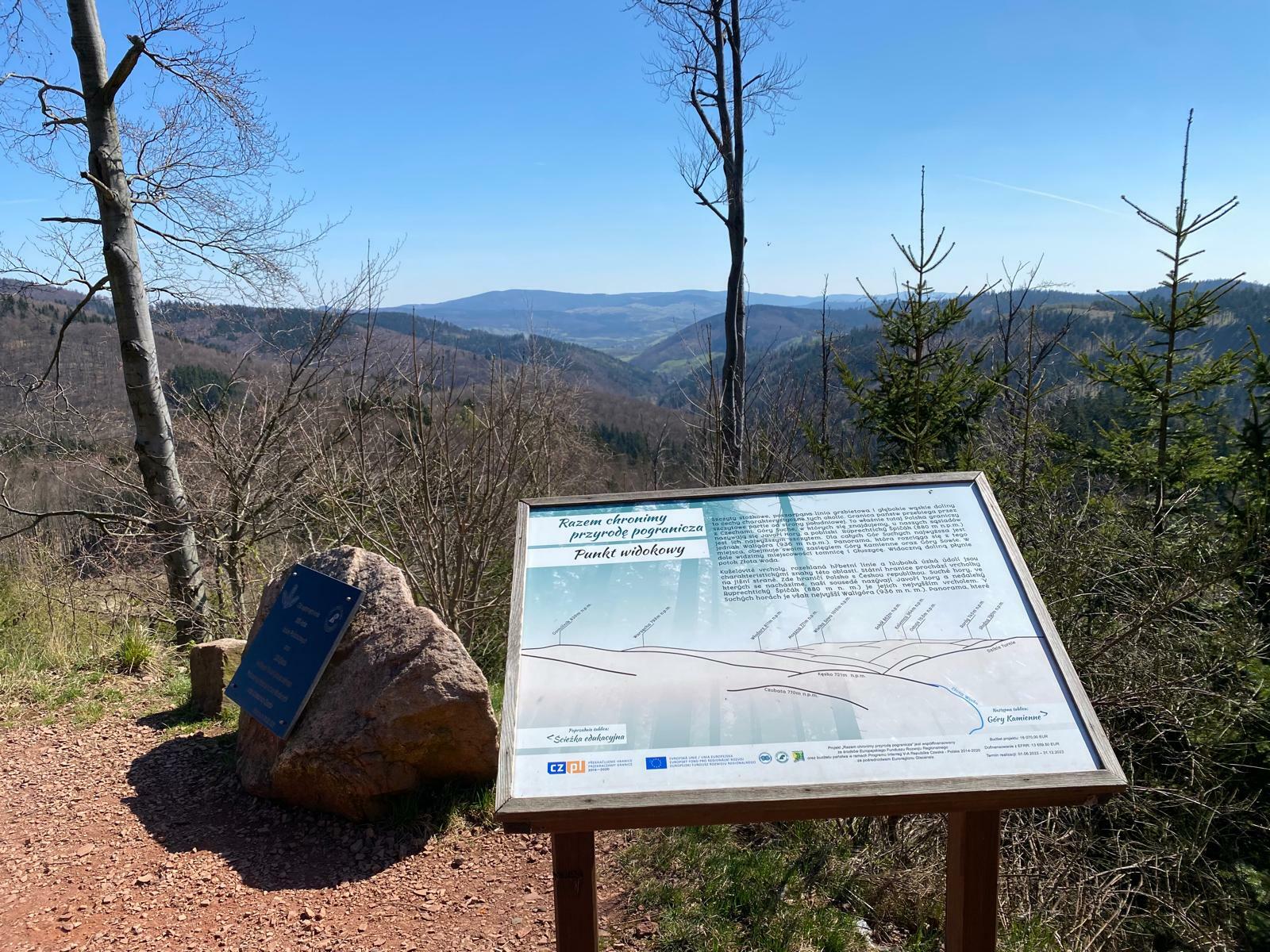 Ta mě postupně dovede až k sedlu hory Světlina (757 m n. m.), kde si z plných plic zanadávám na ty přííííšerné krpály... Stoupání je naštěstí krátké a brzy se mění v rovinku, kde odbočuji vlevo a hle – už jsem v Polsku! Vítá mě tady očouzené ohniště se špalky na sezení, dřevěný přístřešek, kde by se v případě nouze dalo přespat, a o kousek dál i velká mapa a cedule s nápisem Park Krajobrazowy Sudetów Walbrzyskich.