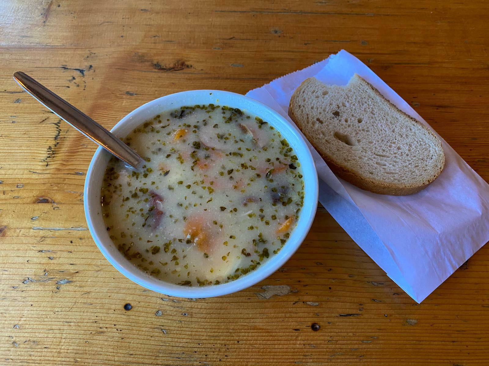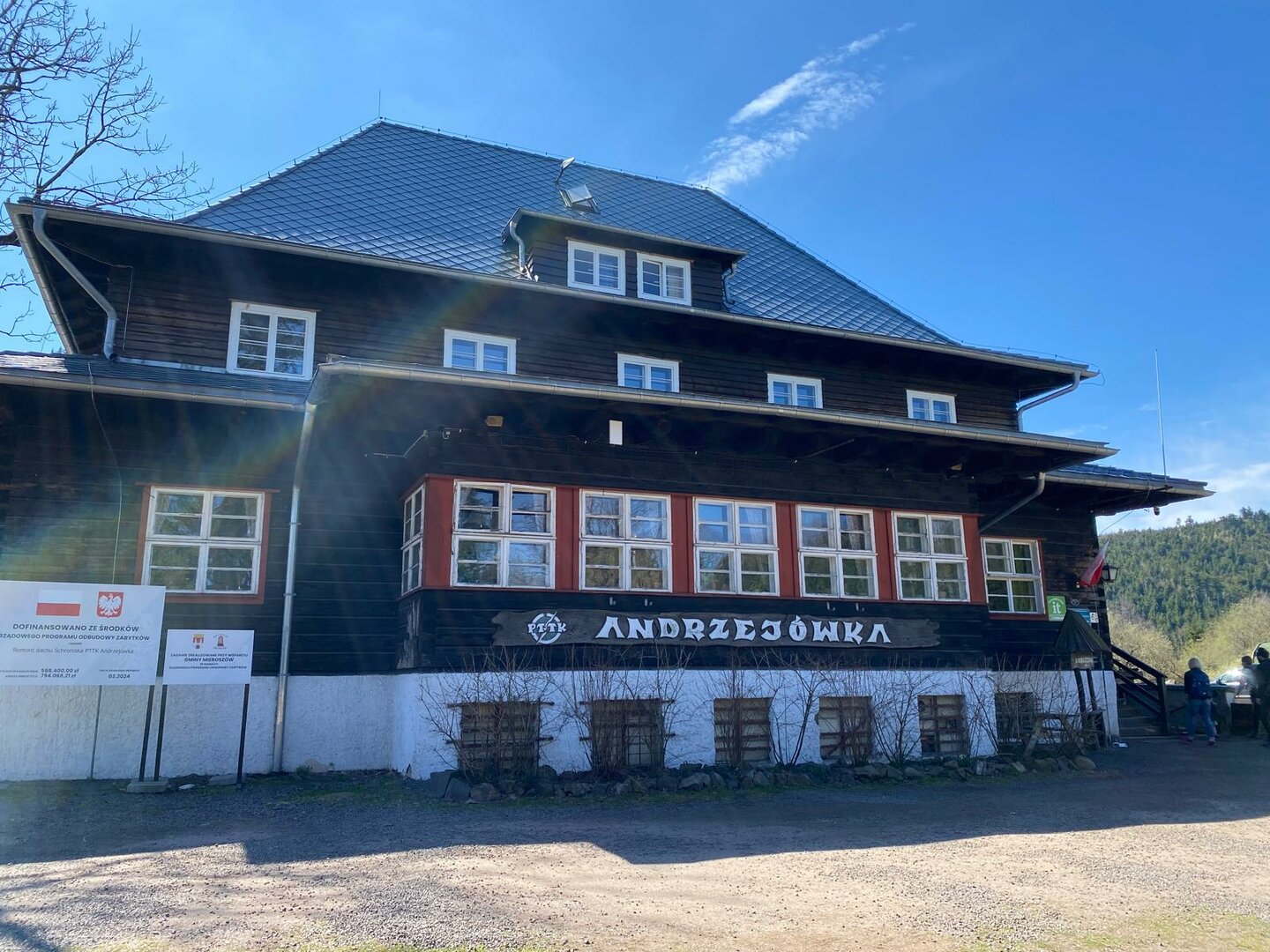 Já už ale přicházím k Andrzejówce – malebné dřevěné chatě v průsmyku Tři údolí, která byla postavena v roce 1933. V únoru 1936 ji navštívily nizozemská královna Wilhelmina a princezna Julianna a zanedlouho poté se – i díky své poloze – stala důležitým spojovacím bodem mezi stezkami západních a východních Sudet. Živo tady je i dneska – koná se tu pochod Boguszowska třicítka, tak se proplétám mezi turisty dovnitř do chaty, kde ochutnávám polévku „zurek z jajkiem“ za 20 zlotých. Dá se tu platit kartou, hurá!