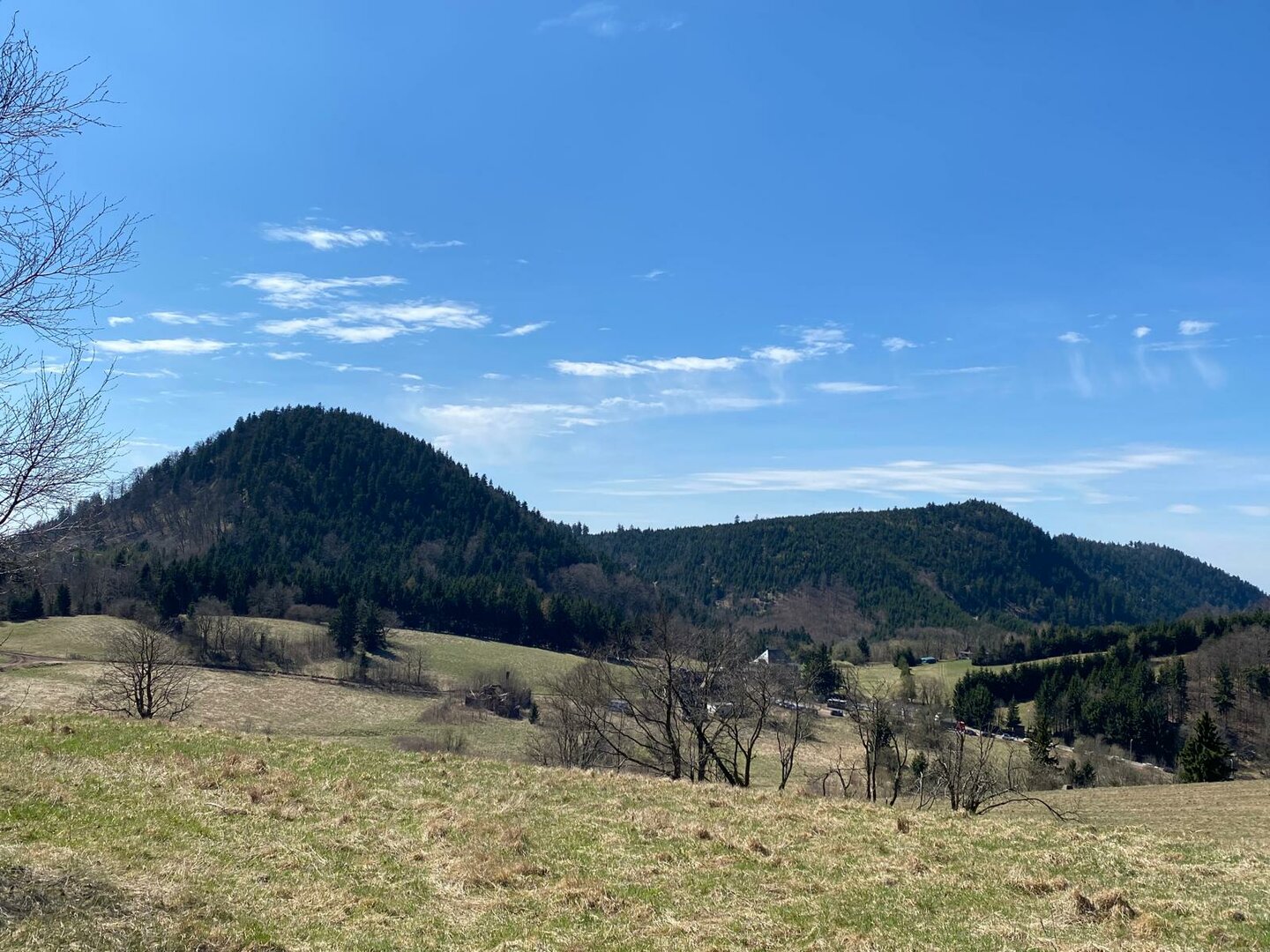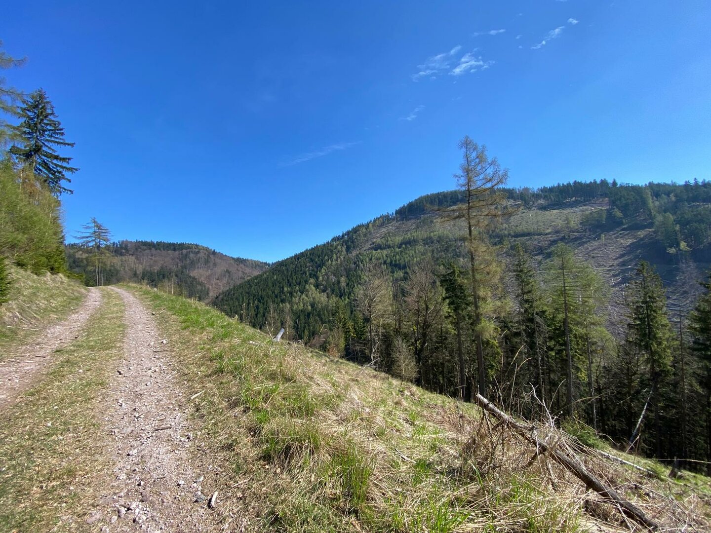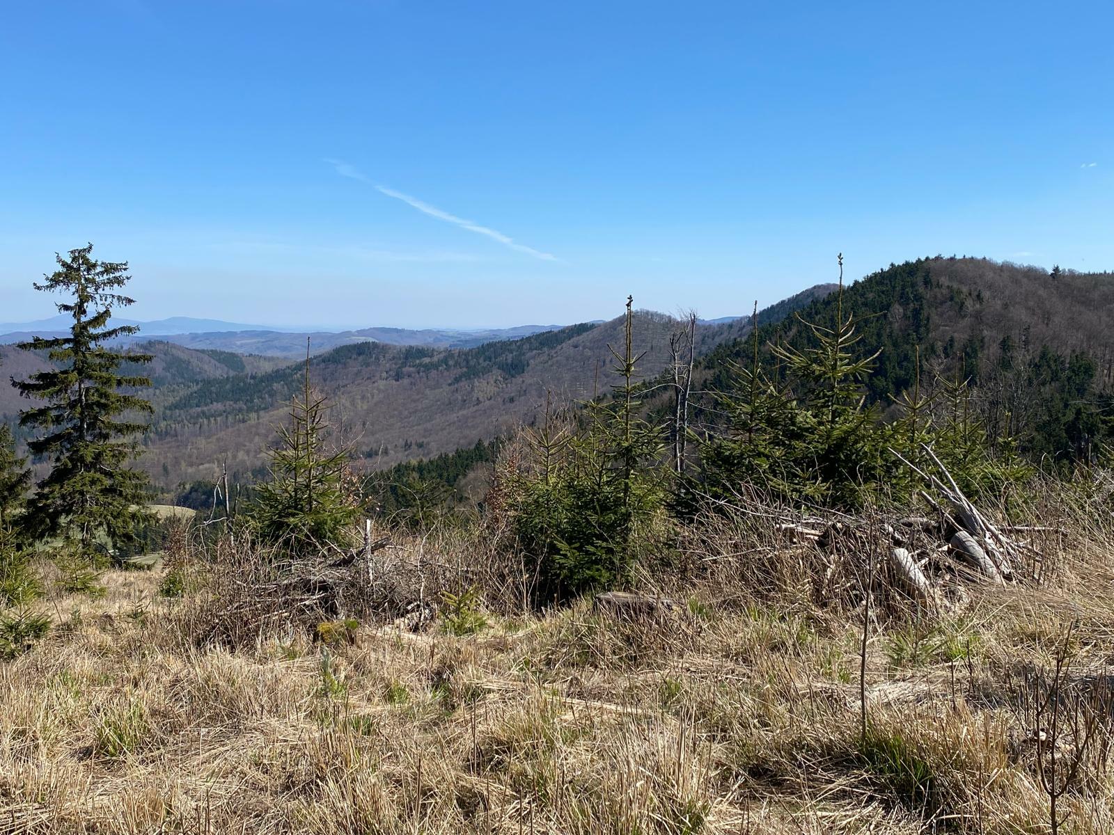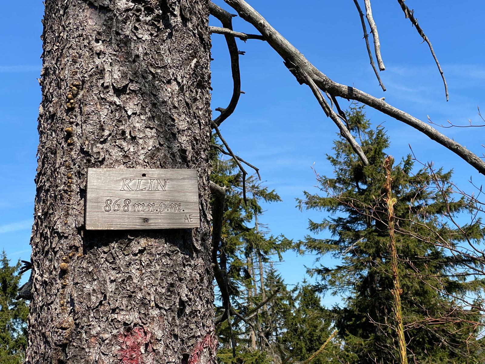 Nejhorší jsou vrcholky bez výhledu, říkám si zklamaně, když dofuním na Klín (868 m n. m.). Mapy mi ale naštěstí ukážou, že o kousek dál je krásný výhled, kde se můžu kochat dle libosti. Půlka výletu už je za mnou a já se vracím 600 metrů zpátky k cyklistickému rozcestníku, kde odbočím vlevo na cyklostezku G3. Ta mě podél úpatí vrcholu Czubata a potoku Zlota Woda dovede zpět k sedlu pod Světlinou.