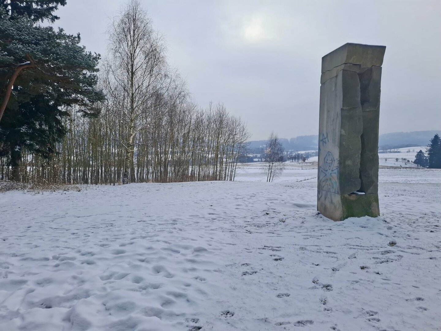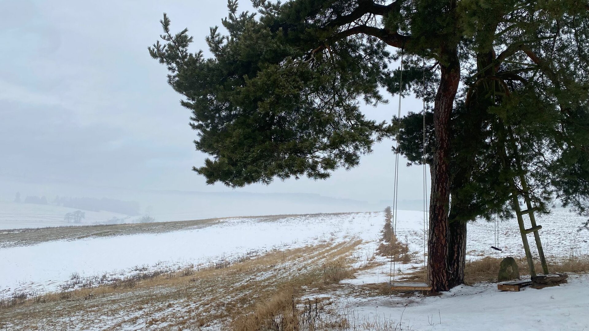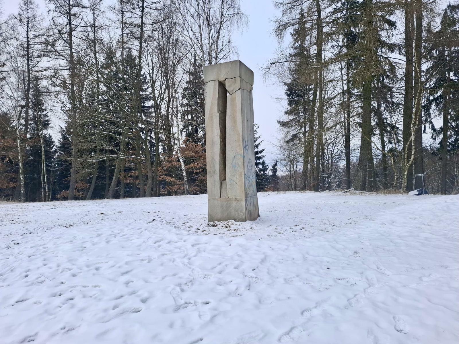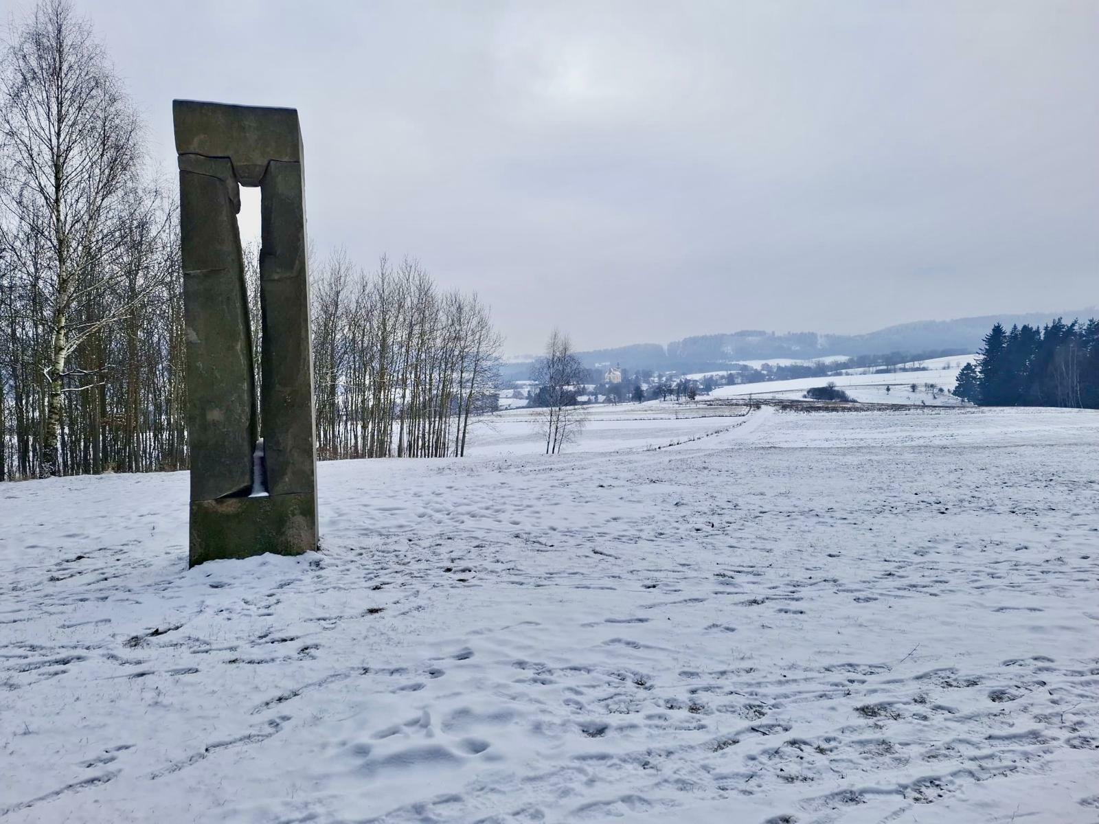 Než k němu ale dojdu, ještě si vyběhnu – nebo spíš vyklouzám – na protější kopeček k osamělé borovici se dvěma houpačkami a vytesaným kamenným koníkem. Během houpání s krásným výhledem do zasněžené krajiny přemýšlím, kdopak asi stojí za těmito houpačkami, které jsou rozesety po celém Broumovsku? Internet mi nic neodhalil, pouze v kuloárech se šeptá, že autoři chtějí zůstat v anonymitě. Škoda…