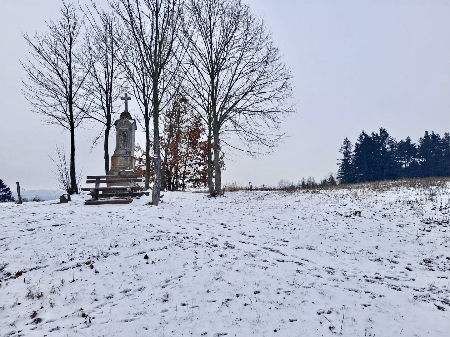 Mráz a křupající sníh mi připomínají, že v lednu si tady toho asi moc neopeču, a tak se raději vydávám opět na cestu, po červené mezi poli. Za chvilku míjím křížek s lavičkou, chvíli se kochám výhledem na Broumovské stěny a zvlněné kopečky, které mi v těchto místech malinko připomínají skotskou vysočinu, a pak pokračuji rovně pořád dál, kolem ohrady, kde dovádějí dva rozpustilí koníci. Právě tady už se objevují první domky Vernéřovic.
