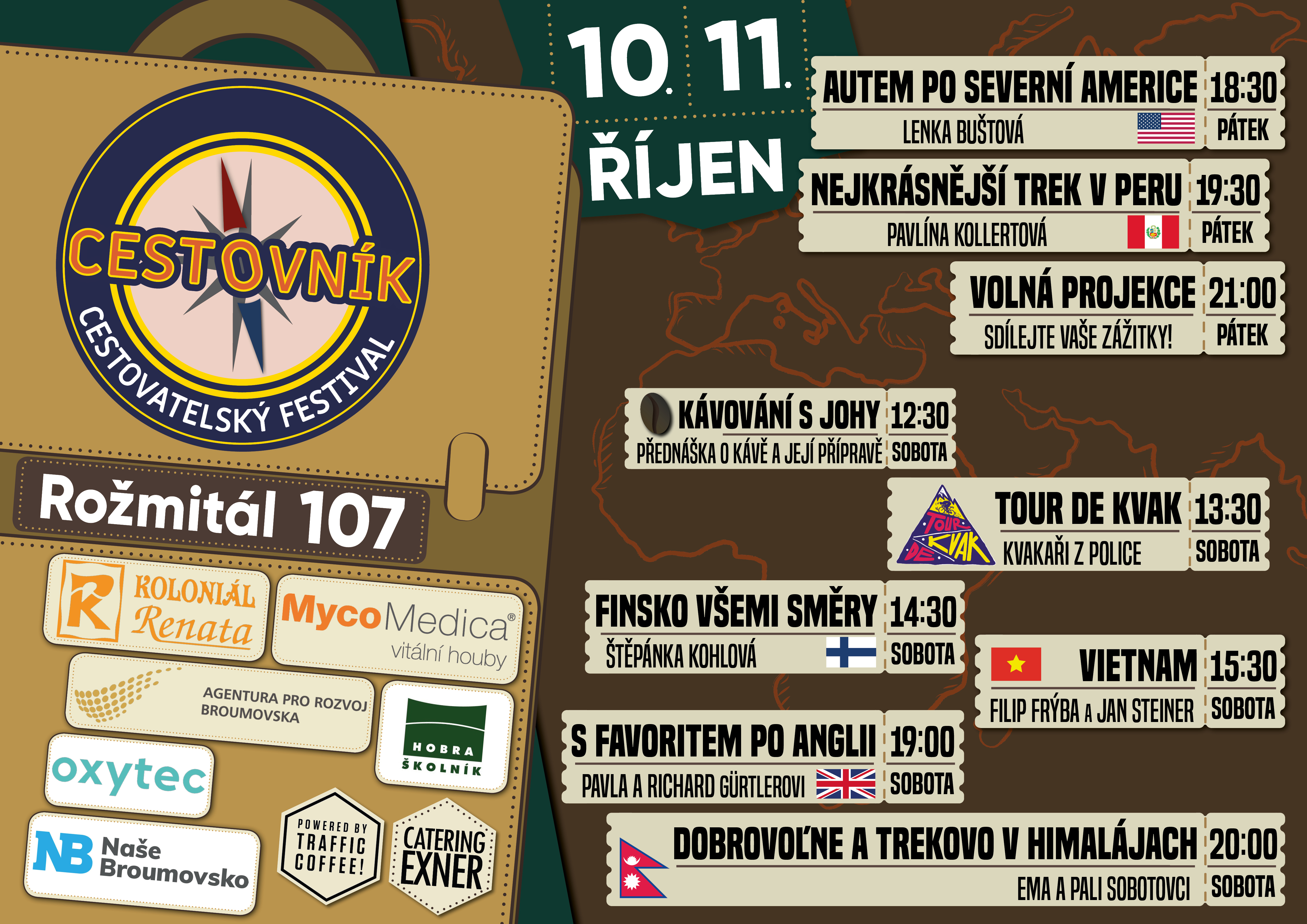 „Proto nezapomeňte na páteční večer donést flashdisky s fotografiemi z cest, volná projekce je pro vás!” Občerstvení bude zajištěno, spát bude možné jak ve škole nebo venku ve vlastním stanu nebo autě. Doprovodný program letos zahrne přednášku o přípravě kávy včetně její degustace, ranní jógu a také výstavu obrázků Vendulky Berkové a cestovatelský výměnný bazárek.