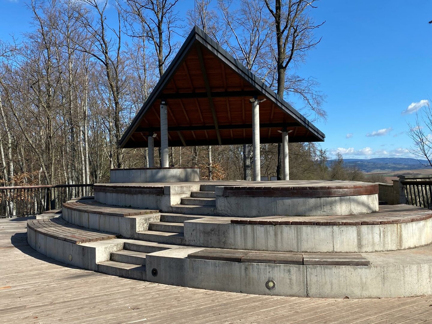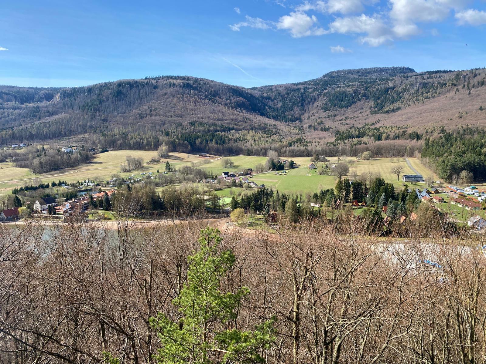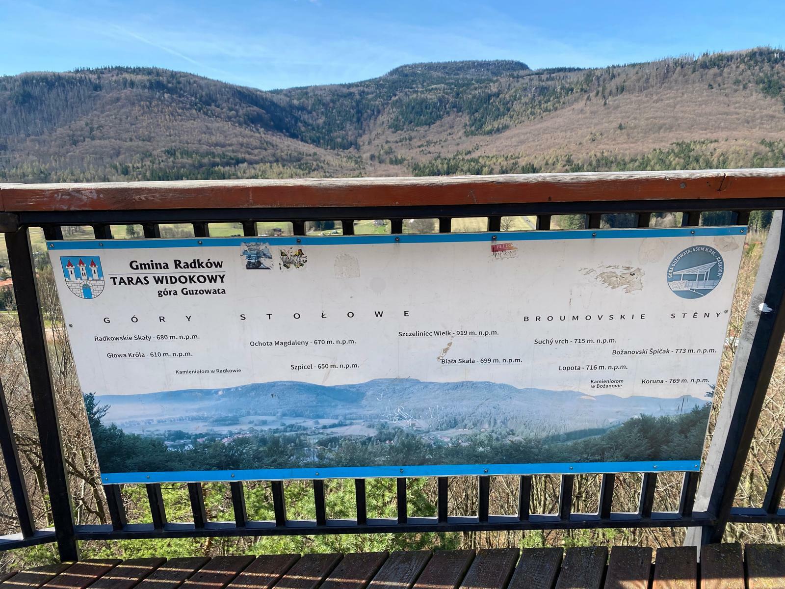 Nejde ale o rozhlednu v pravém slova smyslu. Jedná se spíš o stupňovitou, zčásti krytou betonovou terasu s mnoha dřevěnými lavicemi a stoly, která zde „vyrostla“ v roce 2019. Díky dnešnímu azurovému počasí si tak můžeme užívat krásný výhled na Zalew Radkowski – uměle vytvořené jezero, obklopené chatami a penziony, nad kterým se majestátně tyčí kopečky a skály Stolových hor. Nechybí ani slavná Hejšovina (Szczeliniec Wielki).
