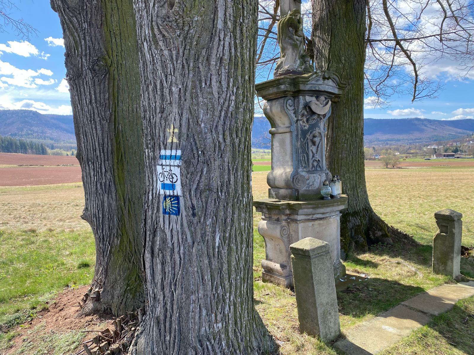 V centru Radkówa se napojíme na modrou turistickou cestu a podél kostela sv. Doroty a místního hřbitova dojdeme na rozcestí (bod 9 v odkazu níže), kde se vydáváme po asfaltce mezi poli směr Vambeřice. Vpravo na nás vykukuje Mnich, místní kopeček s výškou 521 m n. m. Krásnou cestu s výhledy nám trochu kazí silný vítr, který už od rána ne a ne přestat. Po chvíli se napojujeme na Svatojakubskou stezku, značenou typickou žlutou mušlí na modrém pozadí, a hle – už jsme ve Vambeřicích.