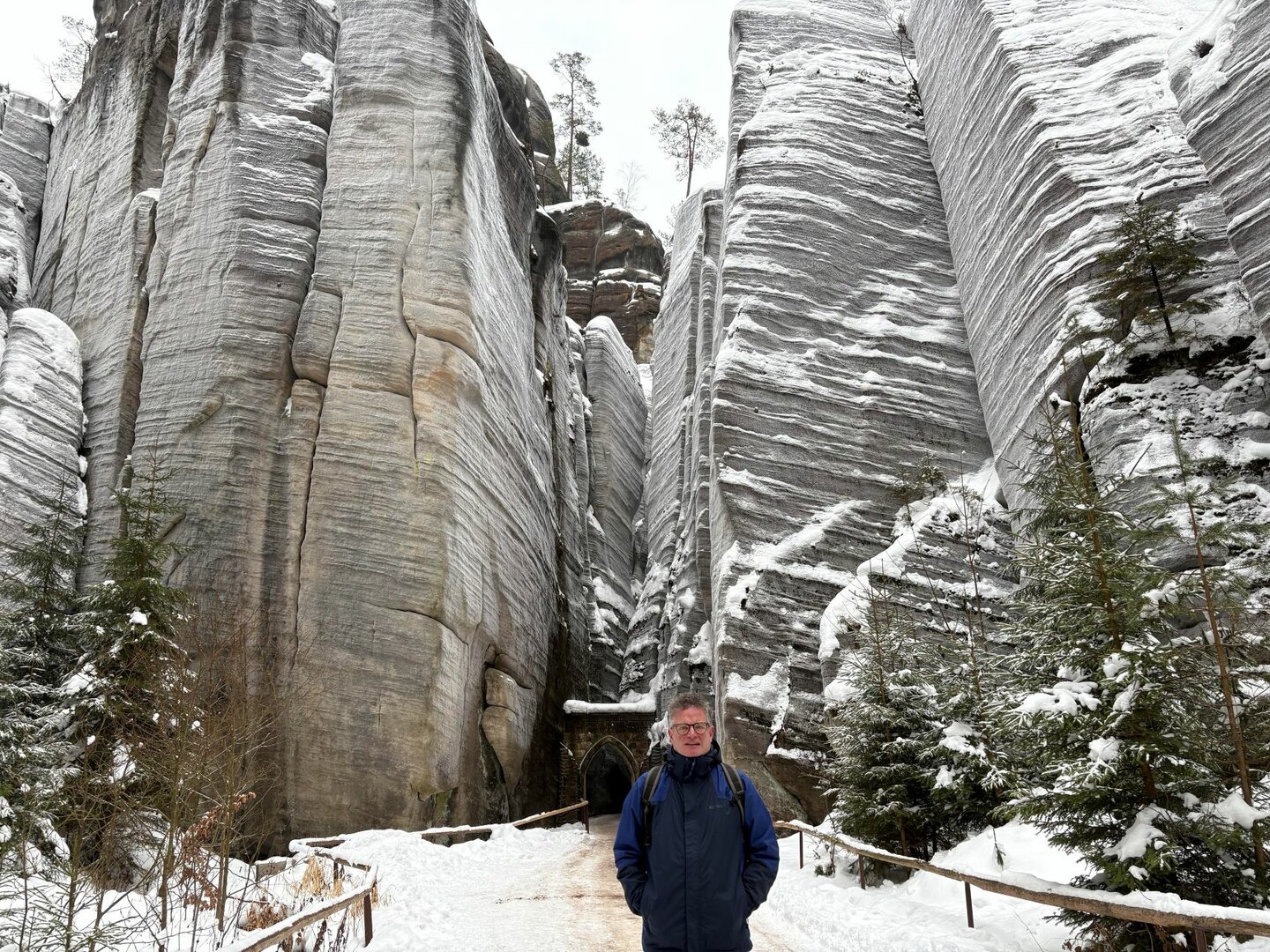 Hynek mi vyprávěl o zdejší krajině, a tak jsem se těšil, až ji prozkoumám. Jednoho dne jsem jel vlakem do Adršpachu a procházel se skalním labyrintem a pak jsem šel lesem do Teplic nad Metují. V létě to musí být krásné místo, ale v zimě, pod sněhem, to bylo opravdu zcela kouzelné, jako z pohádky. Skály samy o sobě jsou surrealistické, jako sochy. Vyrazil jsem také na výlet k Broumovským stěnám, cestou jsem míjel mnoho křížů u cesty a nakonec, v jeden velmi chladný den, jsem vylezl na vrchol Ruprechtického špičáku. Bylo vzrušující dívat se přes hranici do Polska, i když toho dne bylo většinou zakryté mlhou a mraky. Krajina v Broumově je krásná a trochu mi připomínala Peak District v Derbyshire v Anglii, kde jsou také neobvyklé skalní útvary (ale z mnohem hrubšího pískovce), které milují horolezci.