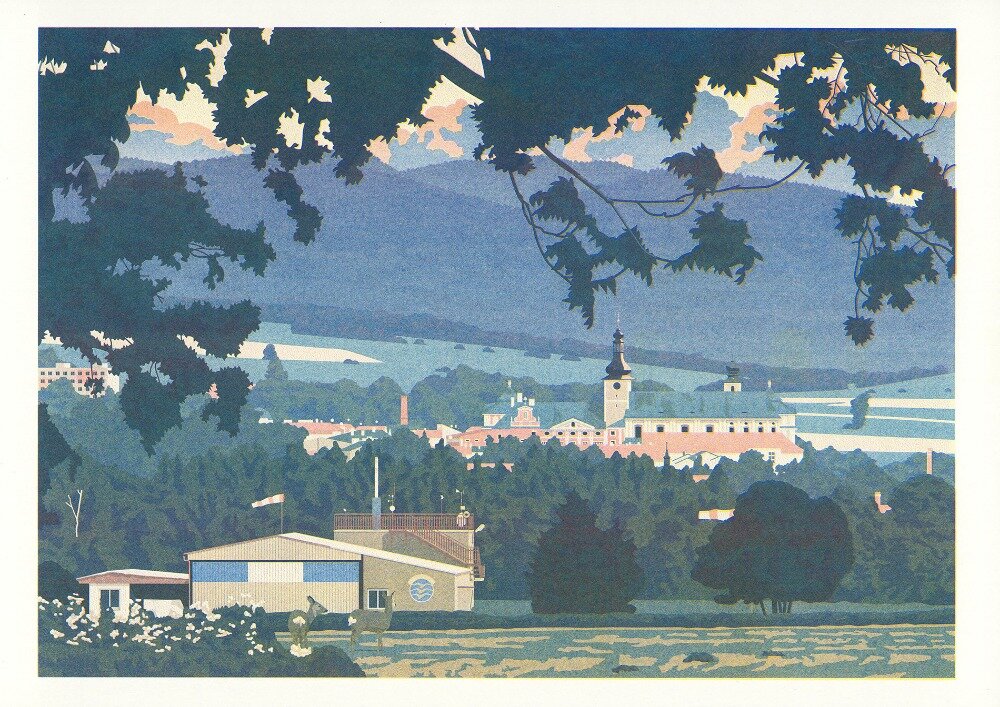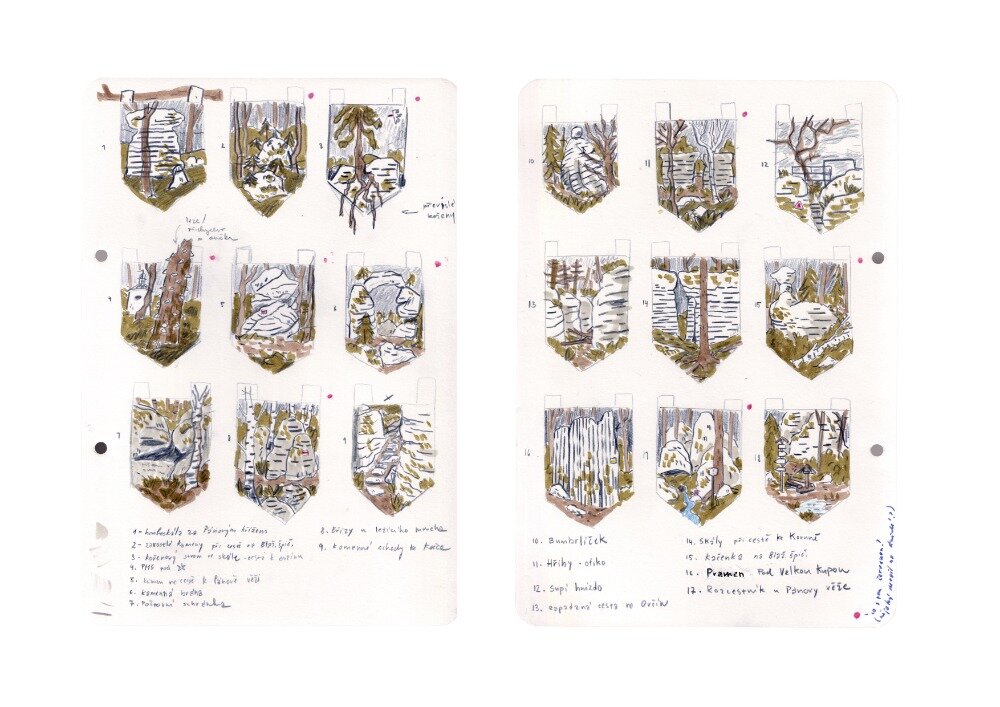 Honza sympozium doslova prochodil. Každý den se vydával na malé i velké výlety a prozkoumával okolí Broumova. Lesy, budovy, skály, kostely – všechno pozorně sledoval a hledal vhodné náměty pro svoji práci. Nakonec se rozhodnul pro dvě kompozice, v nichž se prolíná architektura a krajina, tedy dvě témata, kterým se Honza věnuje dlouhodobě. První ilustrace zachycuje krajinu s barokní kaplí Panny Marie Sněžné na Hvězdě a ve druhé kompozici Honza ztvárnil scenérii Broumova s nedalekým letištěm v popředí.