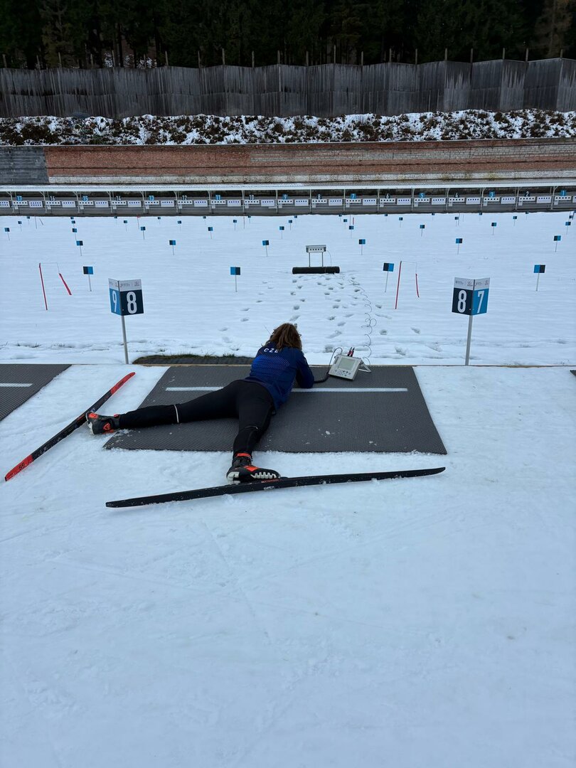 Na střelnici platí přísná pravidla, je tam takzvaná „silent zone“. Trenéři ani David na mě nesmějí mluvit. David mě jen navede k podložce a řekne mi: „Tři, dva, jedna, podložka“ a bouchne mě hůlkou do nohy, abych věděla, že stojím správně, a pak musí odejít deset metrů daleko k trenérům. Od té chvíle už střílím úplně sama. Mluvit na mě může jen na trati, a to mi fakt pomáhá.