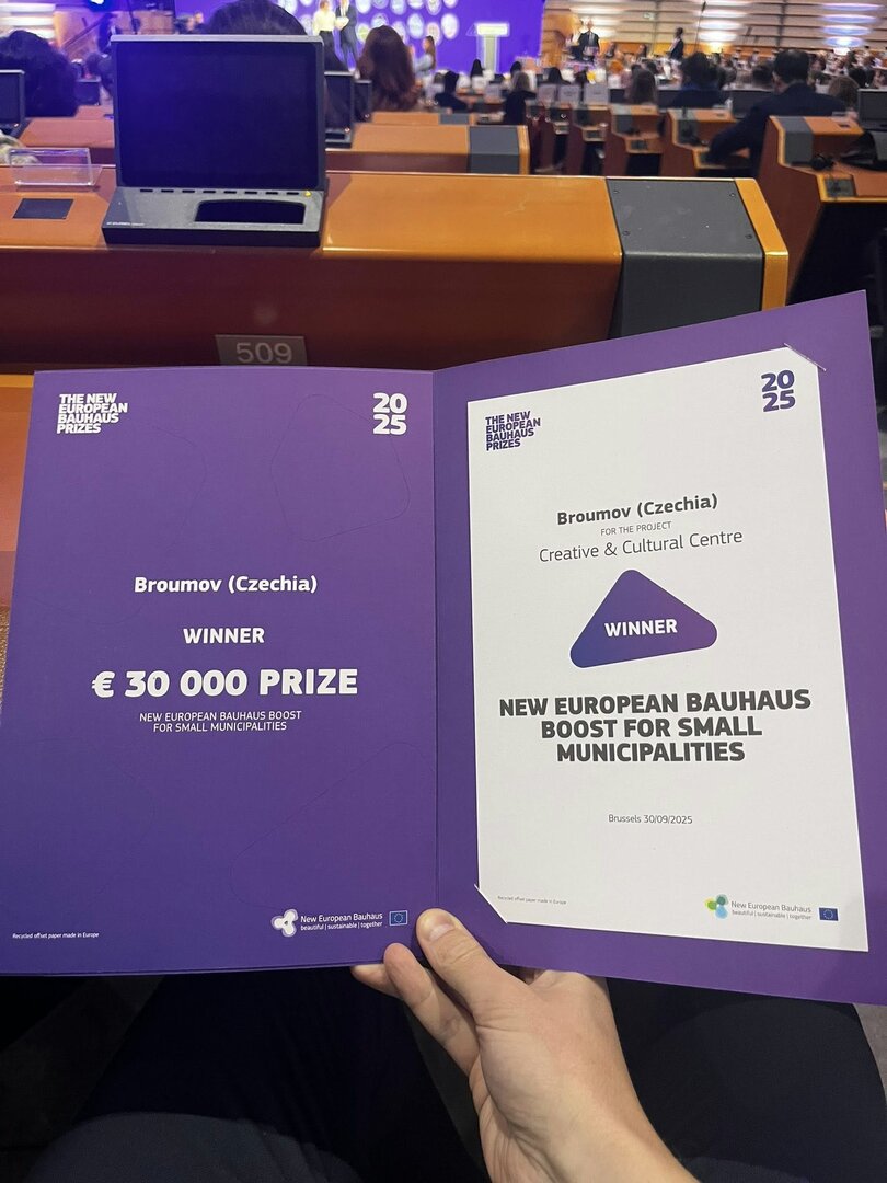 Prestižní ocenění New European Bauhaus a odměnu víc než 700 tisíc korun získal projekt Kulturního a kreativního centra v Broumově - nové knihovny, která se otevře začátkem příštího roku na adrese Opočenského 33. Cenu včera převzal v Bruselu broumovský radní Michal Čepelka.