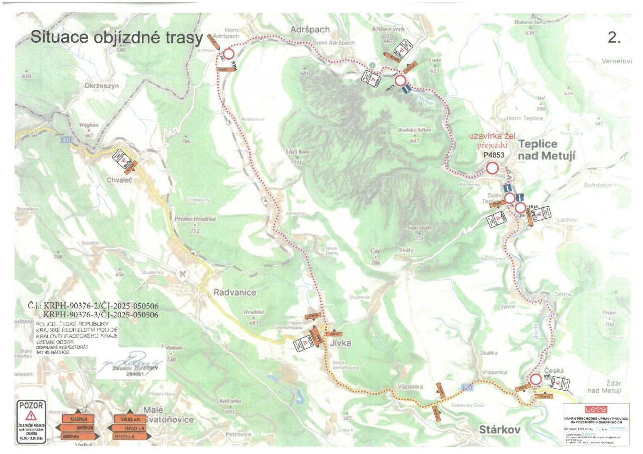 Uzavírka se koná z důvodu realizace reklamační opravy živičného krytu v prostoru frekventovaného přejezdu. Nákladní auta budou muset objíždět Adršpašsko-teplické skály z druhé strany přes Českou Metuji a Jívku. Objížďka pro osobní auta v Teplicích nad Metují povede ulicí Nerudovou a dál jednosměrkami ke koupališti. Doprava bude řízena semafory. Jeden bude umístěn u budovy pošty, druhý nahoře u poustevny (kostela Panny Marie Pomocné).
