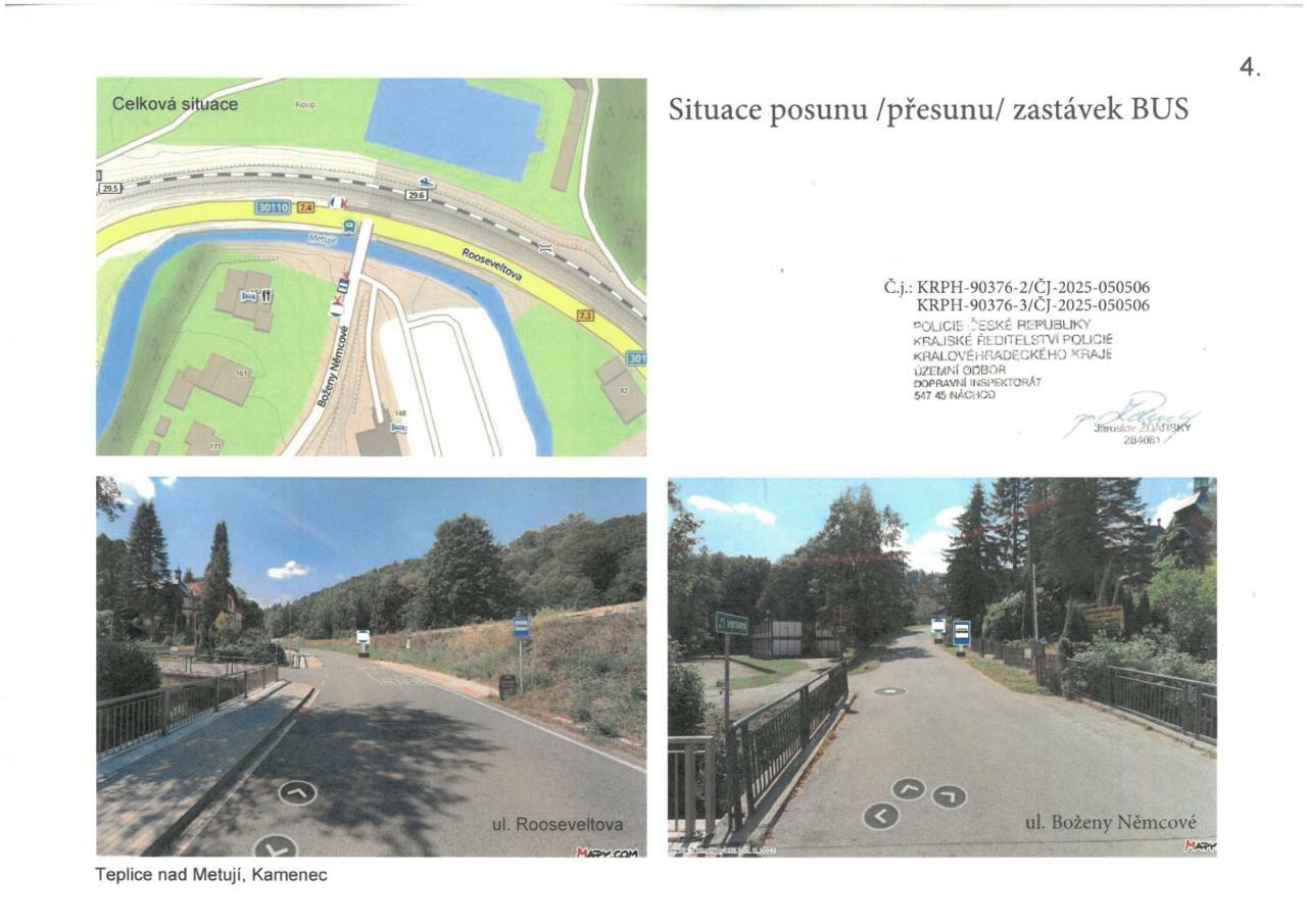 Autobusové zastávka Teplice nad Metují, Kamenec ve směru na Broumov bude po dobu uzavírky přemístěna do ulice Boženy Němcové.