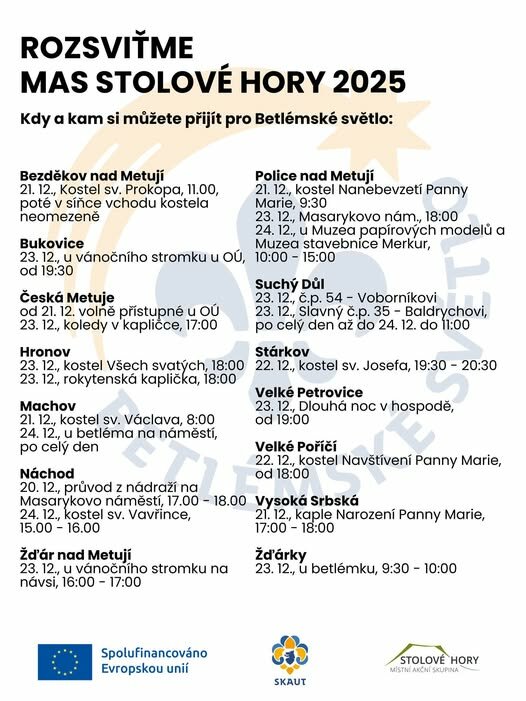 Informace o Betlémském světle v obcích na Policku a v Náchodě přikládáme na plakátu od MAS Stolové hory.