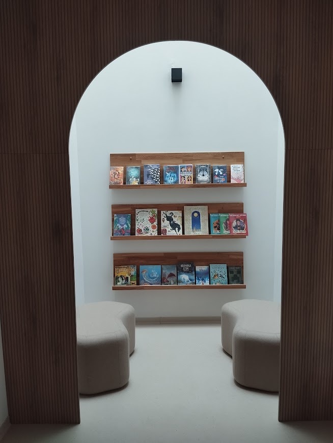 „Také se moc hezky využil starý světlík na vystavení knižních novinek. Je to takový pěkný interiérový detail,“ poukazuje Marta Lelková na výrazný prvek při vstupu do dětského oddělení, který tvoří knihy nasvícené shora střešním oknem starého světlíku a rámované dřevěným obložením.