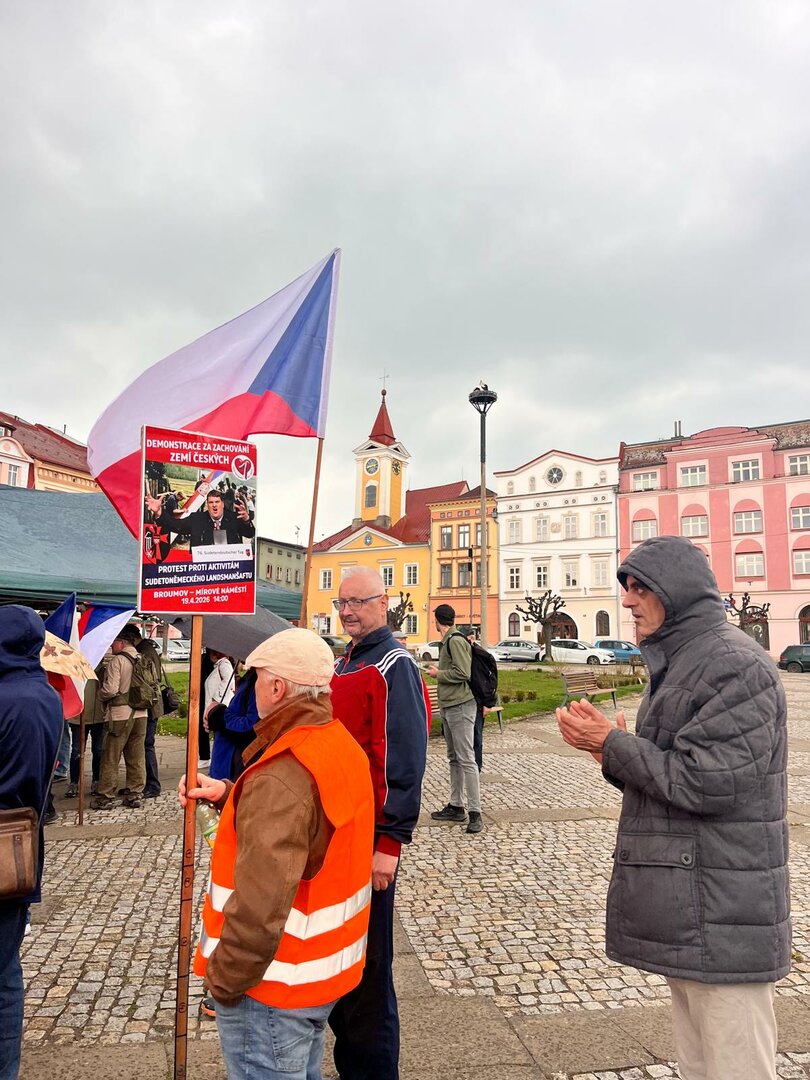 Sjezd Sudetoněmeckého krajanského sdružení, který se má v květnu konat v Brně je aktuálním tématem, okolo kterého se mobilizuje dezinformační a populistická scéna. Zatímco Brno zažilo vyhrocené konání veřejného zastupitelstva, Broumov má za sebou protestní akci s názvem „Demonstrace za zachování ZEMÍ ČESKÝCH“, kterou na neděli 19. dubna svolalo na Mírové náměstí několik spolků a hnutí. Zhruba pětatřicet účastníků s českými vlajkami, v různých krojích a uniformách přitom vesměs nepocházelo z Broumovska.