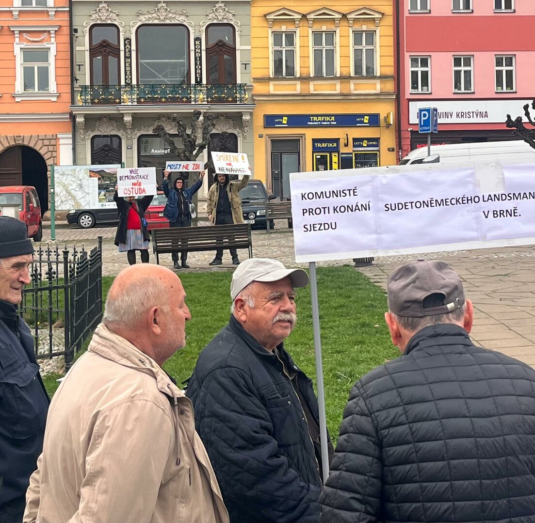„Přišla jsem dneska proto, že se mi nelíbí, že v Brně bude sudetoněmecký sjezd. Na podobné demonstrace nechodím, ale tentokrát jsem přišla. My, co jsme ze Sudet, známe z vyprávění našich prarodičů a rodičů, co si tu zažili jako děti, někteří byli i v odboji. Myslím, že se přátelství mezi Čechy a Němci může být, ale nelíbí se mi tyto sjezdy. Ty ať si pořádají v Německu a ne u nás,“ říká klidným hlasem Karin, jedna z mála účastnic demonstrace, která pochází přímo z Broumova. Druhá žena, která s ní přišla, ji o něco rázněji doplňuje: „Hlavně se nesmí zrušit Benešovy dekrety!“
