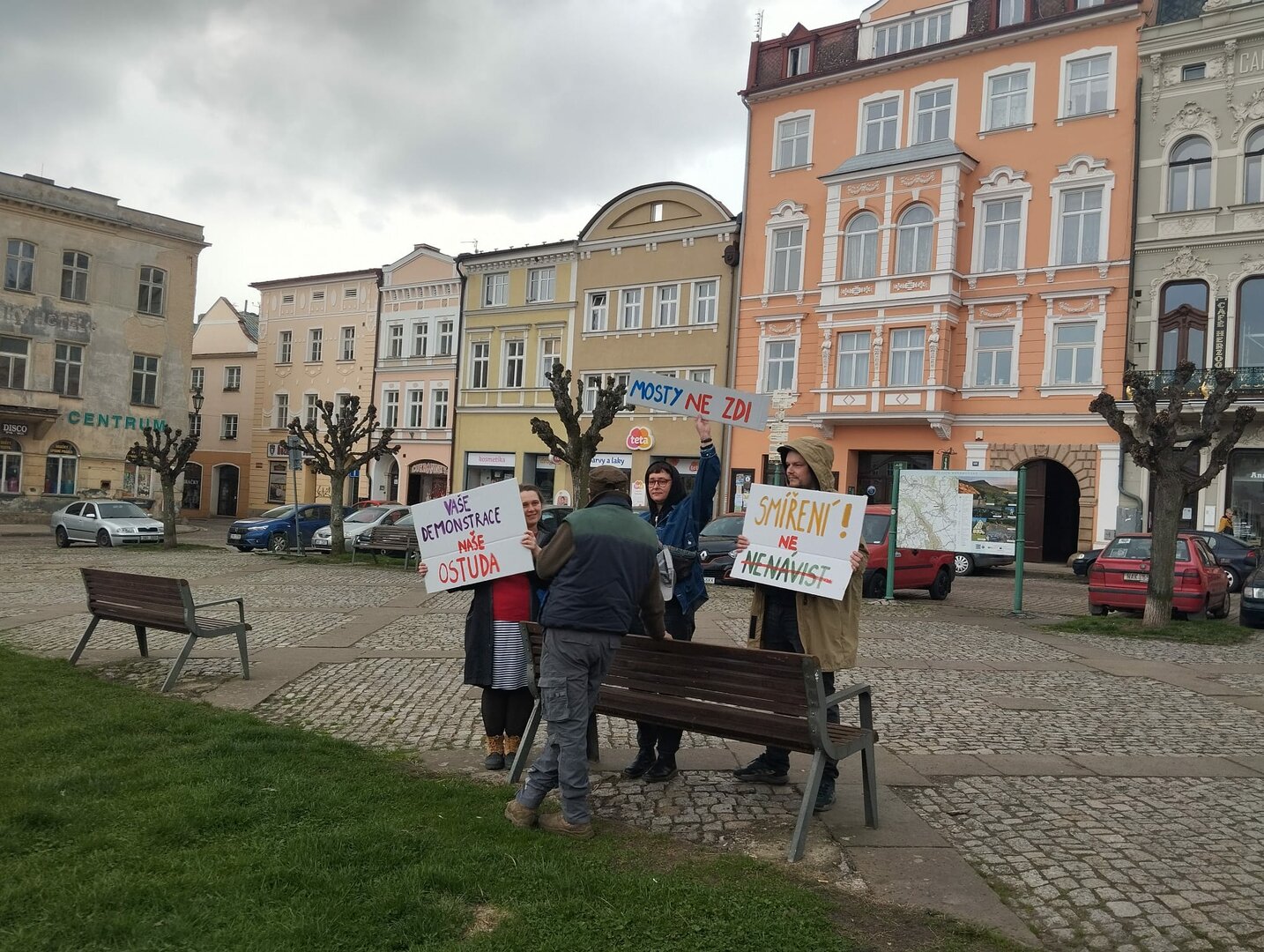 Hned na začátku demonstrace se vedle mariánské sochy objevili i další demonstranti. Drželi v rukou nápisy „Mosty, ne zdi“, „Smíření, ne nenávist“ a „Vaše demonstrace, naše ostuda“. „Naším cílem bylo vyjádřit tichý protest proti tomu, co tam ti lidi říkají a upozornit na to, že ne všichni lžím a manipulacím s minulostí věří. Přišlo nám to spíš smutné, jak lidi věří všemu, co se tam řekne. Přitom se ukázalo, že jde o zástupný problém k vyvolání strachu a mobilizování lidí. Slyšeli jsme, jak se mluví proti Ukrajincům, prezidentovi, Evropské unii, zkrátka proti všemu možnému,“ říká Pavla Jenková, jedna z těch, kteří přišli vyjádřit svůj nesouhlas s tím, co se na náměstí odehrává a dodává: „S potomky sudetských Němců máme velmi dobrou zkušenost, vztahy s nimi budujeme dlouho. Víme, že nikdo z nich nechce rušit Benešovy dekrety a nechtějí své statky zpět. Jezdí si sem připomenout rodinné kořeny.“